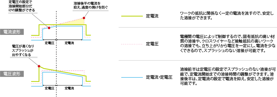 「定電流制御」、「定電圧制御」、「定電流・定電圧制御」の3つの制御方式が選択できます。